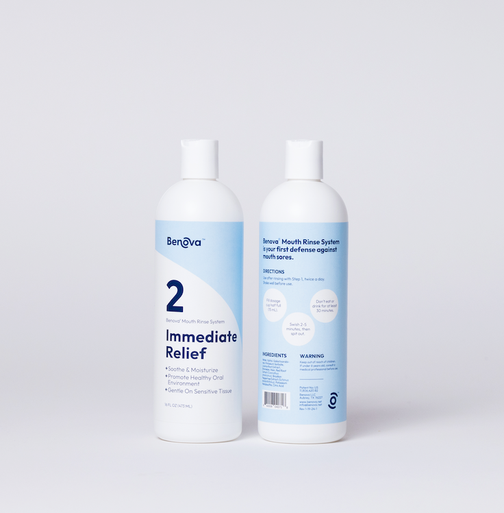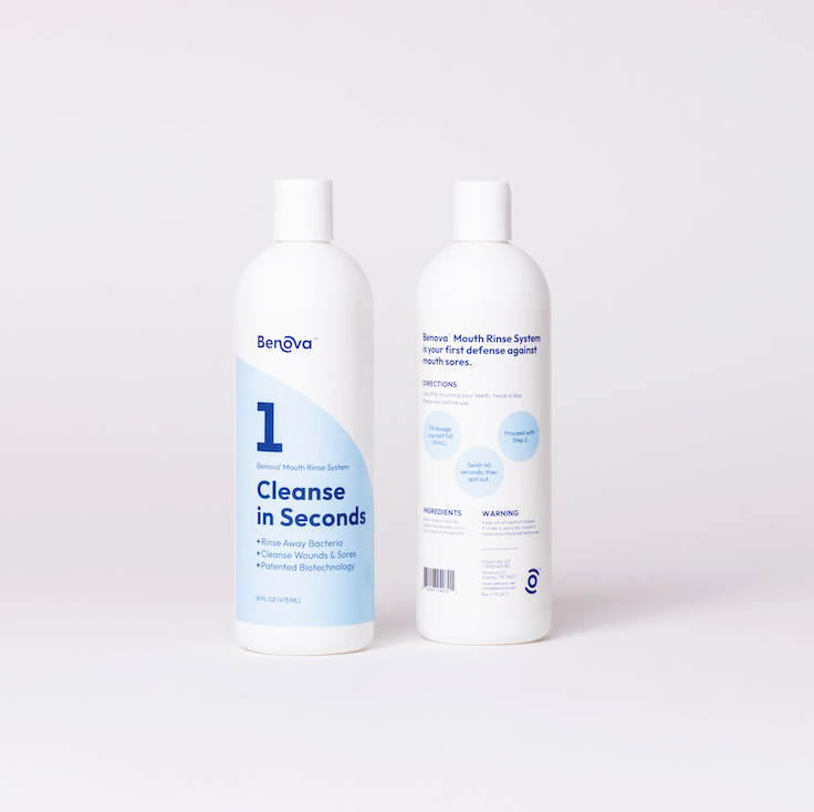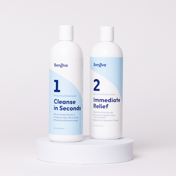 Benova Mouth Rinse is a two-step patented (US11806420B2) system that is gentle on sensitive tissue, yet effective in treating mouth sores. Step 1 gently rinses away bacteria to clean wounds and sores, while Step 2 soothes and moisturizes to promote a healthy oral environment. Both steps work together to ensure your mouth is healthy without the harsh chemicals and burn that can be felt with other mouth rinses.